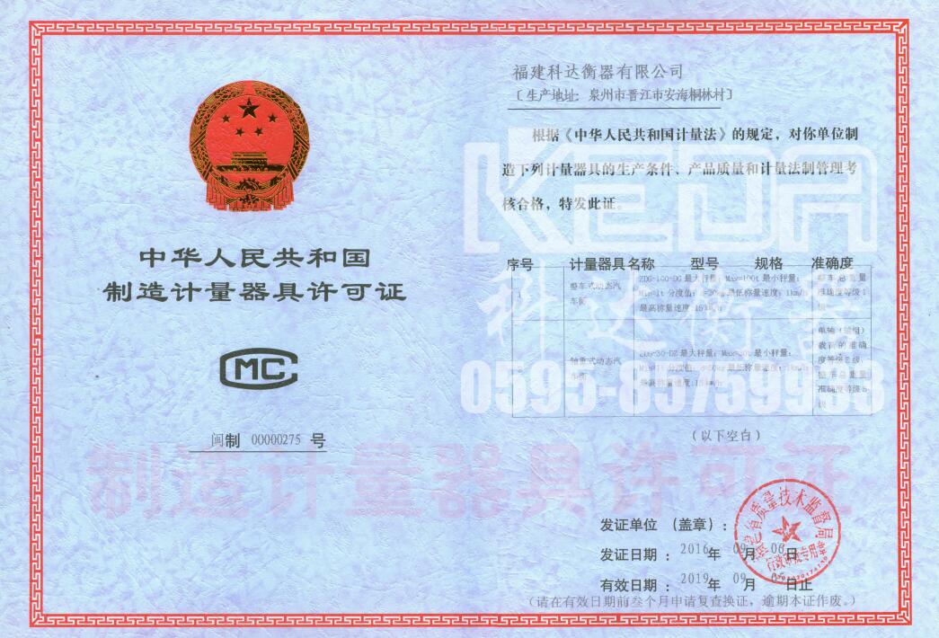 福建科達(dá)衡器獲得福建首張動(dòng)態(tài)汽車衡制造許可證